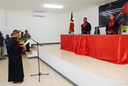 Oecusse, Loron-01, fulan-Outubru, tinan-2025, Prokurad贸r Jer谩l Rep煤blika Dr. Nelson de Carvalho, no akompa帽a husi Adjunta-PJR Dra. Angelina J. Saldanha, hodi f贸 posse ba Dr. Jos茅 Elo, hodi asume kargu nud谩r Koordenad贸r Prokuradoria Rep煤blika Primeira Inst谩nsia Oecusse, no serim贸nia ne鈥檈 hala鈥檕 iha salaun edukasaun Oecusse Ambeno.